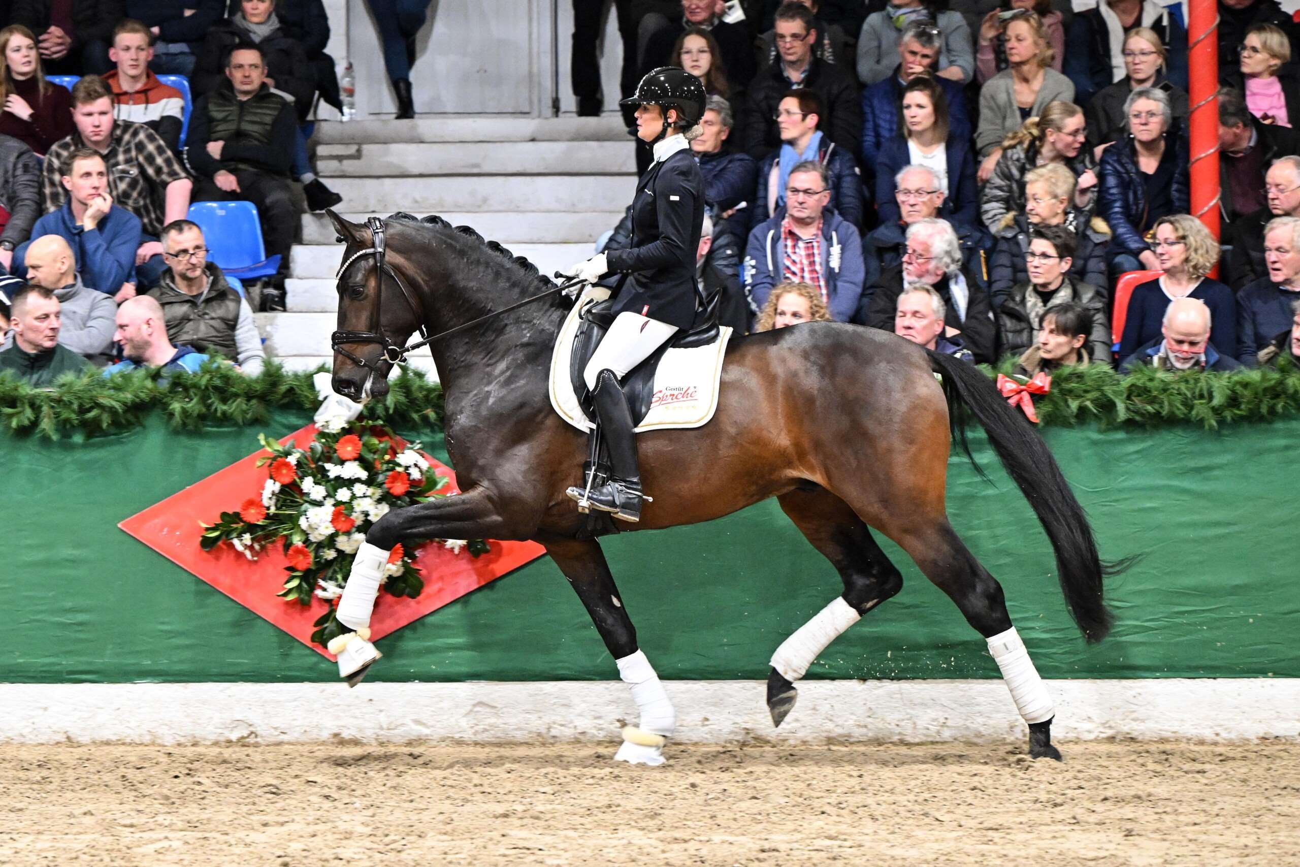 Bon Amour has quickly established himself as the "King of Movement" among his generation, captivating judges and breeders alike with his sublime presence and exceptional dressage qualities. From his first appearance at the pre-selection for the Hanoverian stallion market in Verden, this striking dark brown stallion became the talk of the breeding world, and he delivered on that early promise by earning Premium Stallion status at his licensing. Standing 174 cm, Bon Amour embodies the ideal dressage type with his large frame, clear stallion presence, and outstanding conformation. What truly sets him apart, however, is his extraordinary movement—featuring maximum shoulder freedom, powerful swing, and a natural uphill tendency that marks him as a future star. His lunge work revealed exceptional talent for the higher levels of dressage sport, demonstrating remarkable cadence and excellent interior qualities. In 2023, he demonstrated his quality under saddle at the Münster Handorf Short Performance Test, earning an impressive weighted final score of 8.45 with individual marks of 9.0, 8.8, 7.3, 8.5, and 8.8, showcasing the same exceptional movement and trainability that made him a standout at licensing.