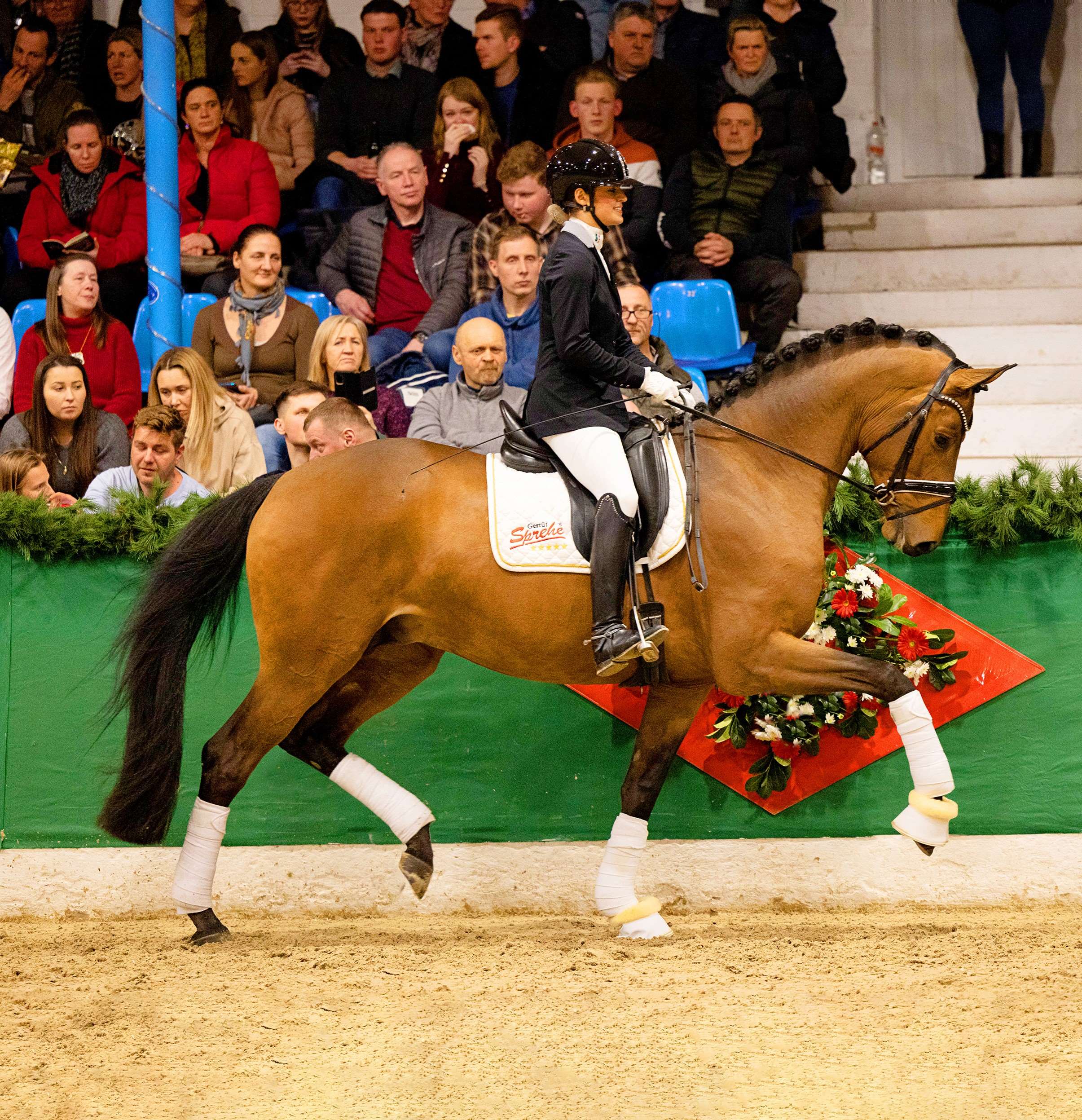Sport Test Verden (2023): Final score 8.53 Trot: 8.8 Walk: 7.5 Canter: 9.2 Rideability: 8.5 Overall Impression: 8.8 Winner Dressage Horse Test Class L (August 2, 2024) with Beatrice Arturi Presented at Trakehner Hengstmarkt 2023 Gala Show Approved for: Trakehner, Westphalia, Oldenburg, Rhineland, German Sport Horse, Breeding Association for German Horses, Hannover (applied), and other associations on request